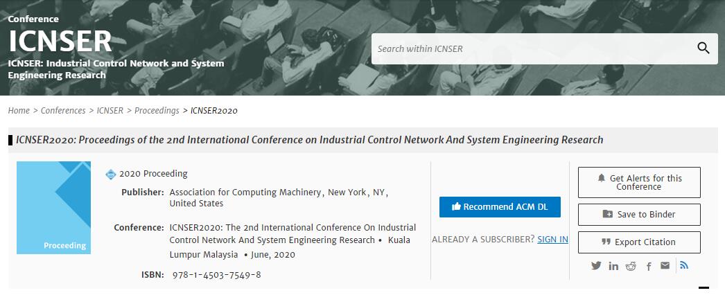The proceedings of ICNSER2020 was published on ACM Digital Library (ISBN: 978-1-4503-7549-8).